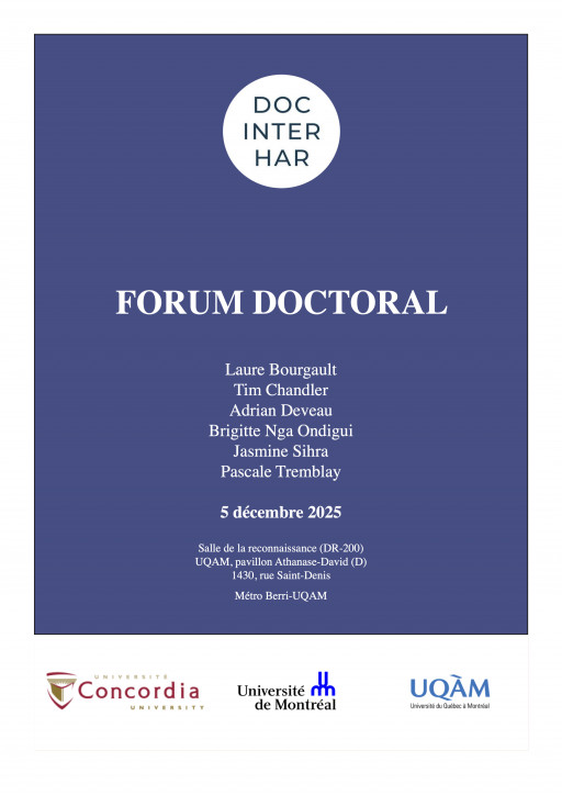 Le forum doctoral réunit professeur.e.s et étudiant.e.s du programme de doctorat interuniversitaire en histoire de l’art afin de favoriser les échanges intellectuels au sein de notre communauté de recherche. Au cours de ses études, chaque étudiante et étudiant présentera publiquement un aspect représentatif de ses recherches et discutera de ses travaux en cours avec ses professeurs et collègues.