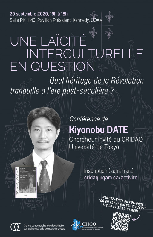 Conférencier : Kiyonobu Date est professeur au Département des études aréales de l’Université de Tokyo, au sein de l’École supérieure des arts et sciences, et chercheur invité au CRIDAQ en septembre 2025. Spécialiste en sciences religieuses, ses recherches portent principalement sur la laïcité et les relations entre religion et société au Japon, en France et au Québec, mais aussi sur les petites nations.